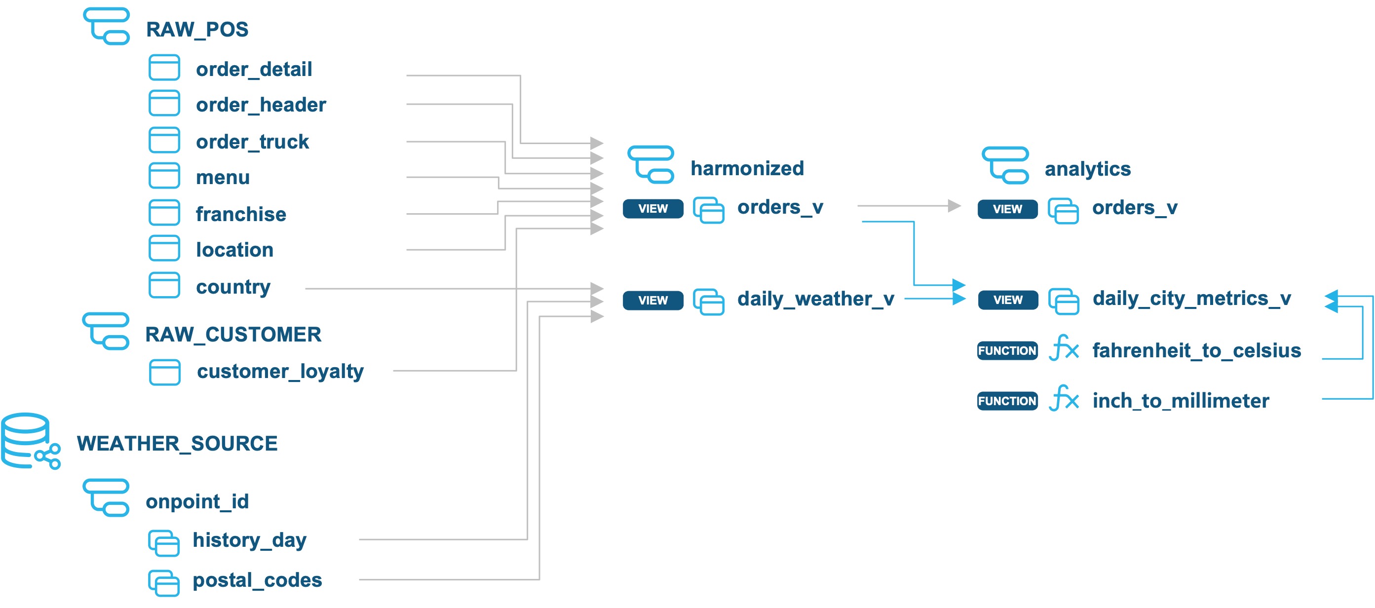 // harmonized 스키마에 orders_v 뷰 생성 CREATE OR REPLACE VIEW harmonized.orders_v AS SELECT oh.order_id, oh.truck_id, oh.order_ts, od.order_detail_id, od.line_number, m.truck_brand_name, m.menu_type, t.primary_city, t.region, t.country, t.franchise_flag, t.franchise_id, f.first_name AS franchisee_first_name, f.last_name AS franchisee_last_name, l.location_id, cl.customer_id, cl.first_name, cl.last_name, cl.e_mail, cl.phone_number, cl.children_count, cl.gender, cl.marital_status, od.menu_item_id, m.menu_item_name, od.quantity, od.unit_price, od.price, oh.order_amount, oh.order_tax_amount, oh.order_discount_amount, oh.order_total FROM raw_pos.order_detail od JOIN raw_pos.order_header oh ON od.order_id = oh.order_id JOIN raw_pos.truck t ON oh.truck_id = t.truck_id JOIN raw_pos.menu m ON od.menu_item_id = m.menu_item_id JOIN raw_pos.franchise f ON t.franchise_id = f.franchise_id JOIN raw_pos.location l ON oh.location_id = l.location_id LEFT JOIN raw_customer.customer_loyalty cl ON oh.customer_id = cl.customer_id; // analytics 스키마에 orders_v 뷰 생성 CREATE OR REPLACE VIEW analytics.orders_v AS SELECT DATE(o.order_ts) AS date, * FROM harmonized.orders_v o;