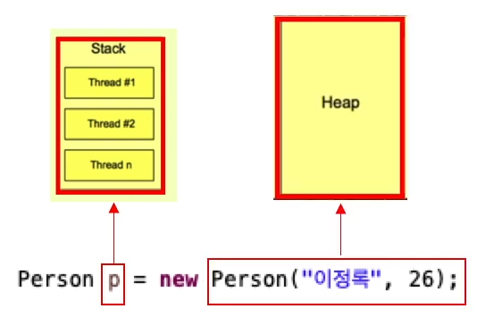 ์๋ฅผ๋ค์ดย Person p = new Person();ย ์ ๊ฐ์ด ํด๋์ค๋ฅผ ์์ฑํ ๊ฒฝ์ฐ,ย newย ์ ์ํด ์์ฑ๋ ํด๋์ค๋ย Heap Areaย ์ ์ ์ฅ๋๊ณ ,ย Stack Areaย ์๋ ์์ฑ๋ ํด๋์ค์ ์ฐธ์กฐ์ธย pย ๋ง ์ ์ฅ๋๋ค.