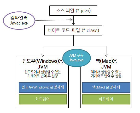 ๋ค๋ง, JVM์ ๋ฐ์ดํธ์ฝ๋(*.class)๋ฅผ ๊ฐ OS๋ณ๋ก ๋ค๋ฅธ ๊ธฐ๊ณ์ด(Binary Code)๋ก ๋ณ์ญํด์ผ ํ๋ค.