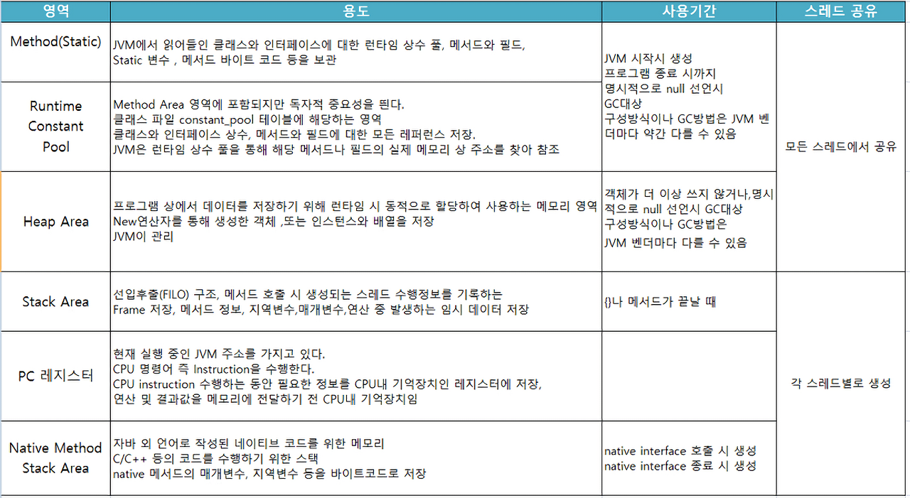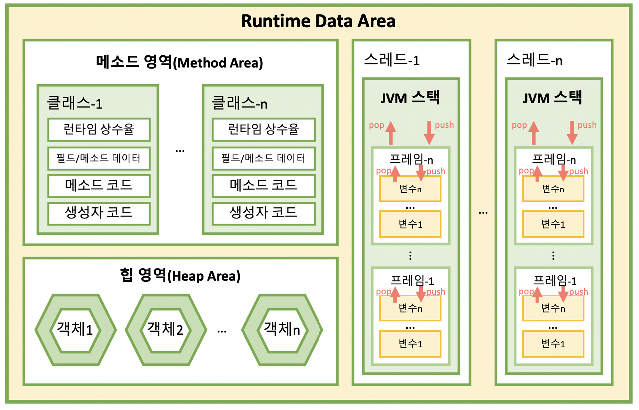 ํ ์์ญ์ ๋ฉ์๋ ์์ญ์ ํจ๊ป ๋ชจ๋ ์ฐ๋ ๋๊ฐ ๊ณต์ ํ๋ฉฐ, JVM์ด ๊ด๋ฆฌํ๋ ํ๋ก๊ทธ๋จ ์์์ ๋ฐ์ดํฐ๋ฅผ ์ ์ฅํ๊ธฐ ์ํด ๋ฐํ์ ์ ๋์ ์ผ๋ก ํ ๋นํ์ฌ ์ฌ์ฉํ๋ ์์ญ์ด๋ค.