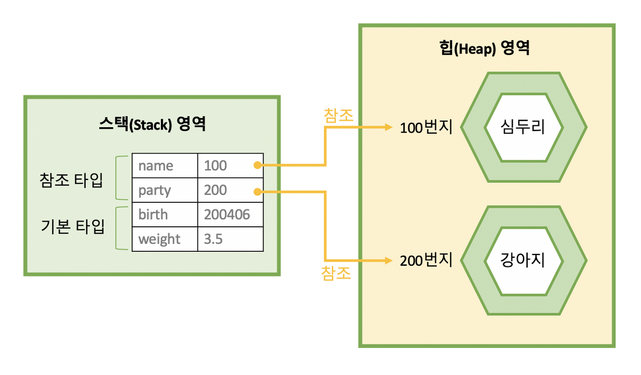 ๋จ, ๋ฐ์ดํฐ์ ํ์ ์ ๋ฐ๋ผ ์คํ(stack) ๊ณผ ํ(haeap)์ ์ ์ฅ๋๋ ๋ฐฉ์์ด ๋ค๋ฅด๋ค๋ ์ ์ ์ ์ํด์ผ ํ๋ค.
