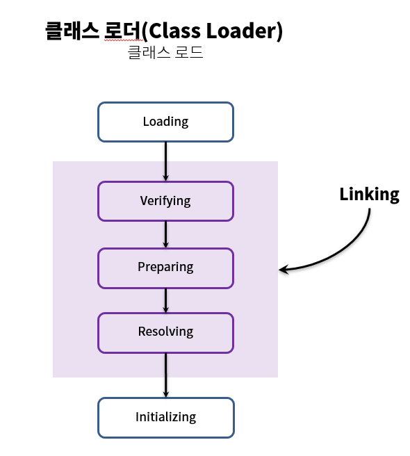 Loading(๋ก๋) : ํด๋์ค ํ์ผ์ ๊ฐ์ ธ์์ JVM์ ๋ฉ๋ชจ๋ฆฌ์ ๋ก๋ํ๋ค.Linking(๋งํฌ) : ํด๋์ค ํ์ผ์ ์ฌ์ฉํ๊ธฐ ์ํด ๊ฒ์ฆํ๋ ๊ณผ์ ์ด๋ค.Verifying(๊ฒ์ฆ) : ์ฝ์ด๋ค์ธ ํด๋์ค๊ฐ JVM ๋ช