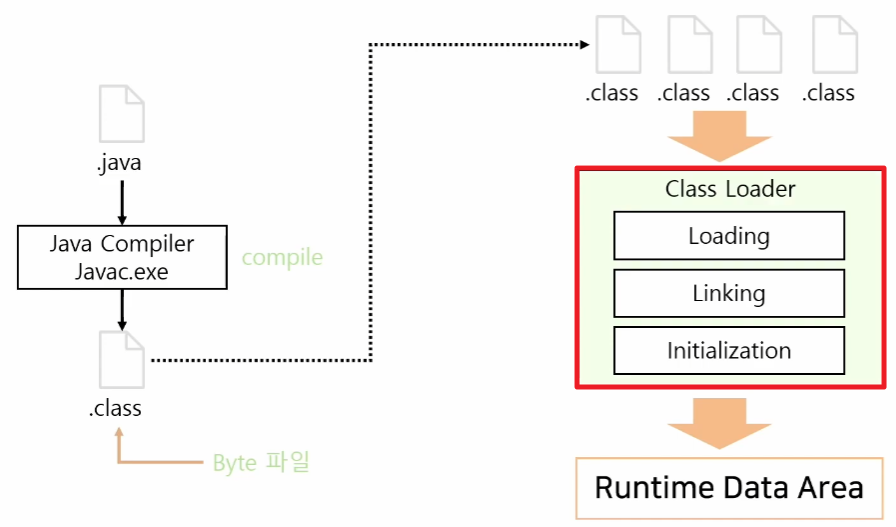 ์ฆ, ๋ก๋๋ ๋ฐ์ดํธ ์ฝ๋(.class)๋ค์ ์ฎ์ด์ JVM์ ๋ฉ๋ชจ๋ฆฌ ์์ญ์ธ Runtime Data Area์ ๋ฐฐ์นํ๋ค.