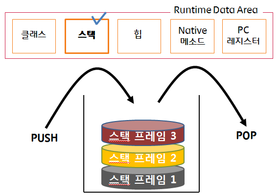 ๋ฉ์๋๊ฐ ํธ์ถ๋ ๋๋ง๋ค ํ๋ ์์ด ๋ง๋ค์ด์ง๋ฉฐ, ํ์ฌ ์คํ์ค์ธย ๋ฉ์๋ ์ํ ์ ๋ณด๋ฅผ ์ ์ฅํ๋ ๊ณณ์ด๋ค. ๋ฉ์๋ ํธ์ถ ๋ฒ์๊ฐ ์ข ๋ฃ๋๋ฉด ์คํ์์ ์ ๊ฑฐ๋๋ค. ์คํ ํ๋ ์์ ์์ด๋ ๋ฐ์ดํฐ๋ ๋ฉ์๋์ ๋งค๊ฐ๋ณ์, ์ง์ญ๋ณ์, ๋ฆฌํด๊ฐ, ์ฐ์ฐ์ ๊ฒฐ๊ณผ๊ฐ ๋ฑ์ด ์๋ค.