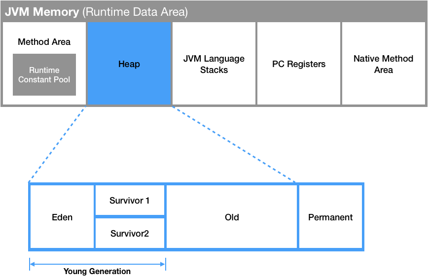 ์ด๋ ๊ฒ ๋ค์ฏ๊ฐ์ง ์์ญ(Eden, survivor 0, survivor 1, Old, Permanent)์ผ๋ก ๋๋ ํ ์์ญ์ ๋ค์ ๋ฌผ๋ฆฌ์ ์ผ๋ก Young Generation ๊ณผ Old Generation ์์ญ์ผ๋ก ๊ตฌ๋ถ๋๊ฒ ๋๋๋ฐ ๋ค์๊ณผ ๊ฐ๋ค.