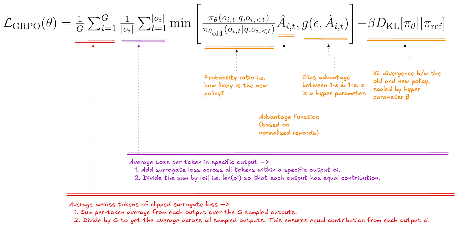 좀 더 간략히 수식으로 작성하자면 GRPO의 목적 함수는 다음과 같다.
