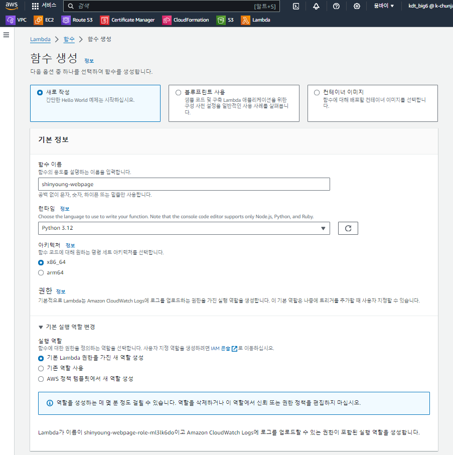 - 새로 작성 > 함수 이름 : 이니셜-webpage > 런타임 : Python 3.9
