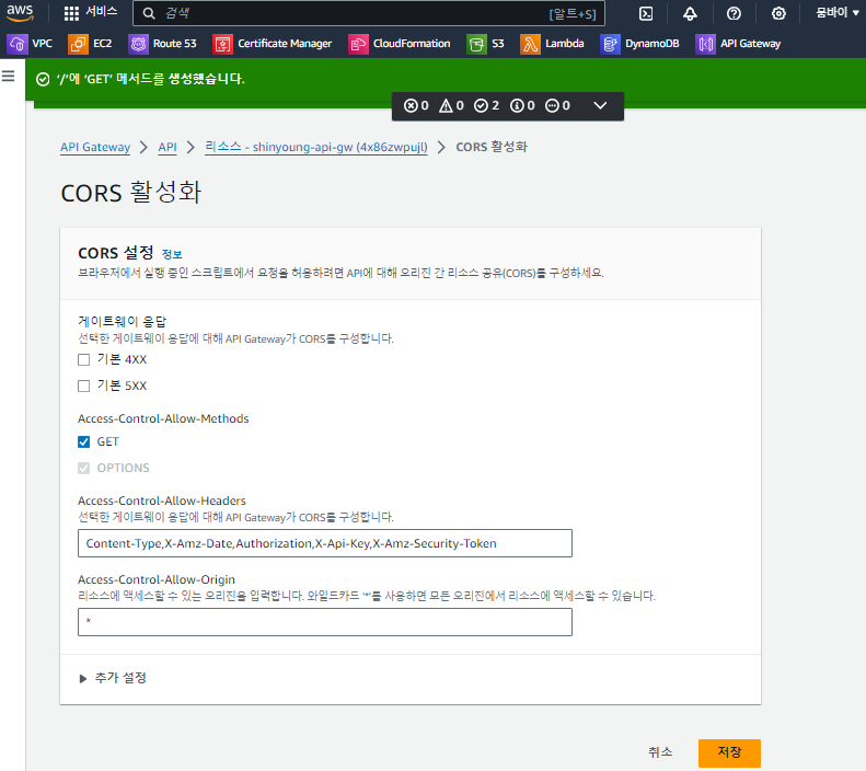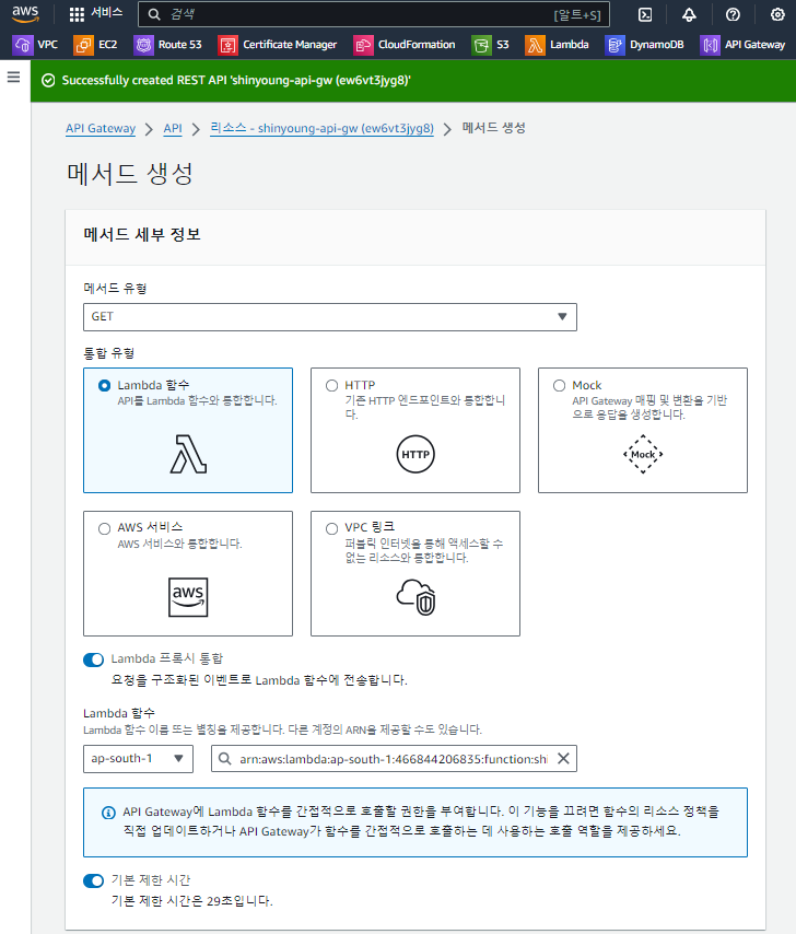 - API 생성 > REST API 구축 > API 이름 : 이니셜-api-gw