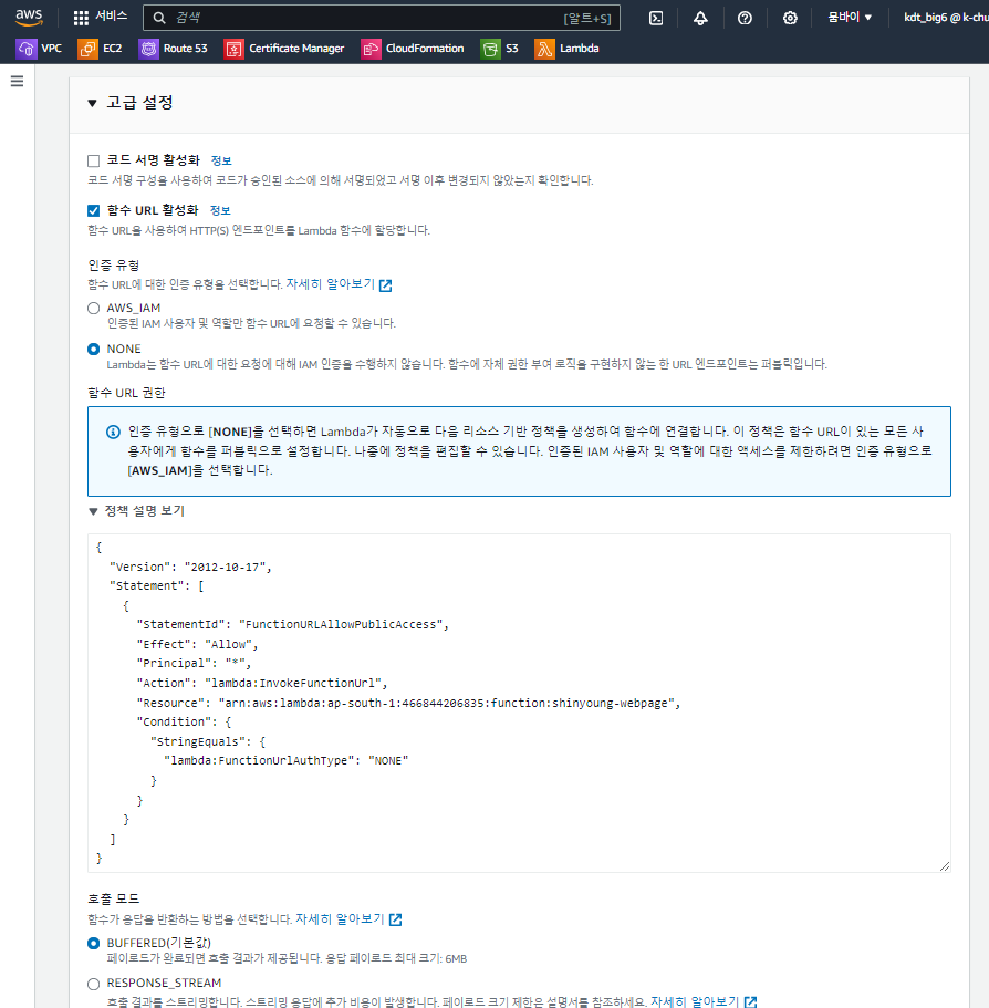 - 고급 설정 > 함수 URL 활성화 : NONE