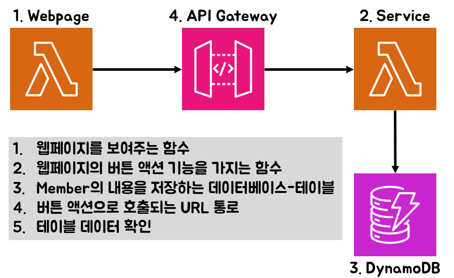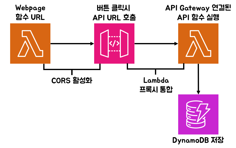 📌최종적으로 완성한 구조는 다음과 같다. Webpage 함수, API 함수, API Gateway, DynamoDB로 쉽고 빠르게 텍스트와 버튼이 출력되는 웹페이지를 구축해 보았다.