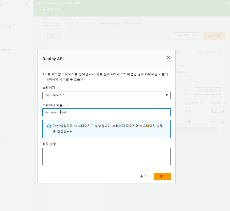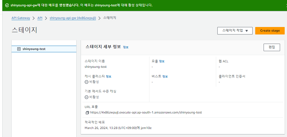 - 작업 > API 배포 > 새 스테이지 > 이름 : test > 배포