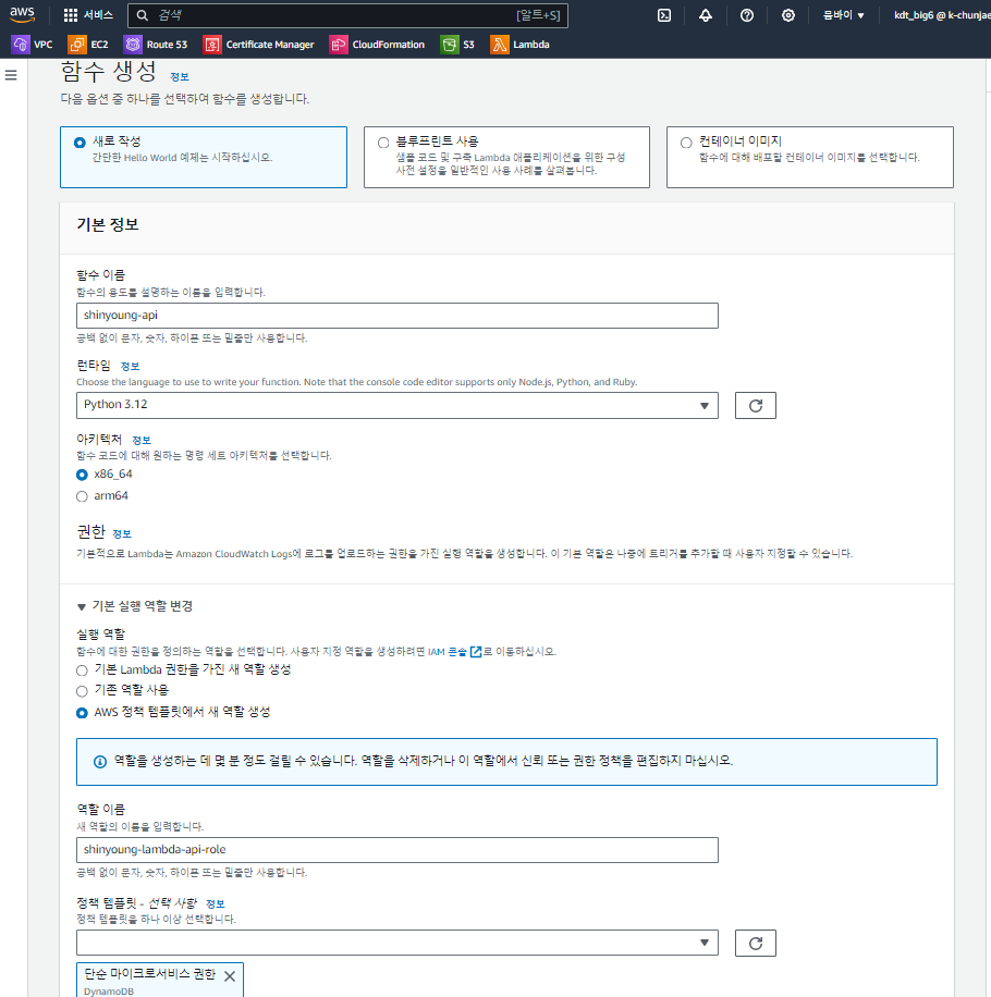 - 기본 실행 역할 변경 > 기본 Lambda 권한을 가진 새 역할 생성