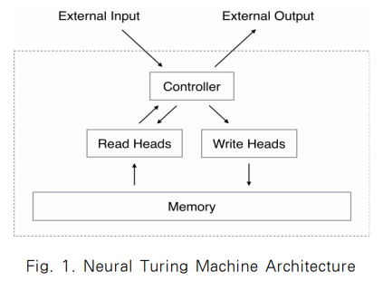 Alex Graves ์ธ(2014)๊ฐ ์ ์ํ NTM(Neural Turing Machines)์ ํฌ๊ฒ ์ ๊ฒฝ๋ง์ผ๋ก ์ด๋ฃจ์ด์ง ์ปจํธ๋กค๋ฌ(controller)์ ๊ฐ์ค์น ๋ฒกํฐ(weight vector)๋ฅผ ์ ์ฅํ๋ ๋ฉ๋ชจ๋ฆฌ๋ก ๊ตฌ์ฑ๋์ด ์์ต๋๋ค. NTM์ ์ ์ฒด ์ํคํ ์ฒ๋ Fig. 1.๊ณผ ๊ฐ์ผ๋ฉฐ, ๋ฉ๋ชจ๋ฆฌ์ ์ปจํธ๋กค๋ฌ ์ฌ์ด์๋ ์ฝ๊ธฐ ํค๋(read heads)์ ์ฐ๊ธฐ ํค๋(write heads)๋ก ๊ตฌ์ฑ๋์ด ์์ต๋๋ค.