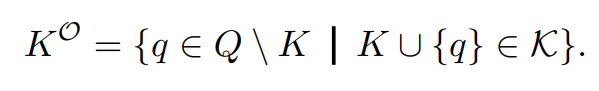𝐾는 𝑄의 부분집합들로 이루어진 모음(collection)입니다. 이 부분집합들은 학습자가 지식을 어느 정도 알고 있는지를 나타냅니다. 중요한 조건은 빈 집합 ∅(아무런 개념도 모르는 상태)과 도메인 𝑄 자체(모든 지식을 알고 있는 상태)도 𝐾에 포함되어 있어야 합니다. 예시는 다음과 같습니다.