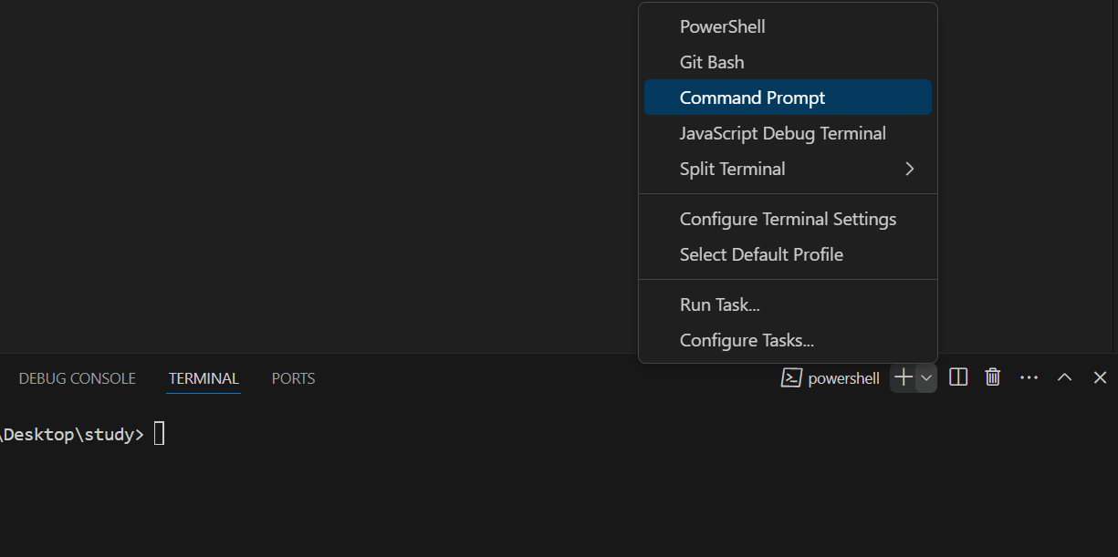 - 새로운 터미널을 열어줍니다.(단축키 : Ctrl+` (백틱:물결 아래 있음))
