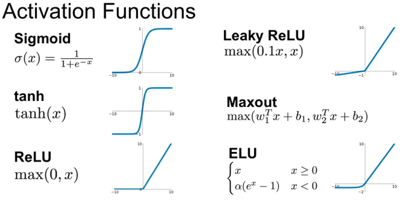 | 은닉층 | ReLu, Leaky ReLu | 기울기 소실(Gradient vanishing) 문제를 줄이고 다음 층으로 신호를 전달한다. |