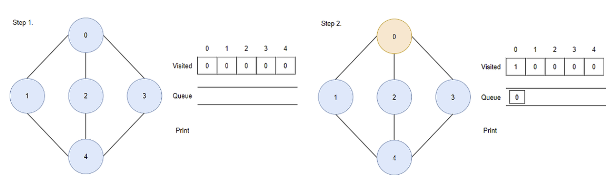 - Step 2. 시작 노드를 방문하여 방문 표시를 한 뒤 큐에 삽입