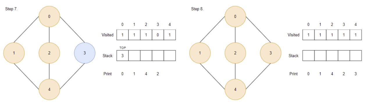 - Step 8. pop된 노드 2에서 방문하지 않은 노드가 없기 때문에 스택 맨 위에 있는 노드 3을 pop하고 방문 표시, 탐색 종료