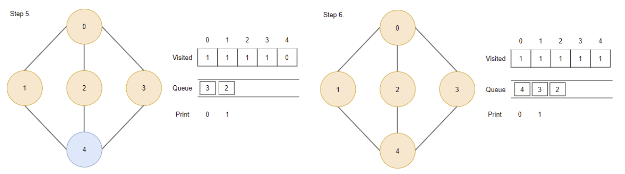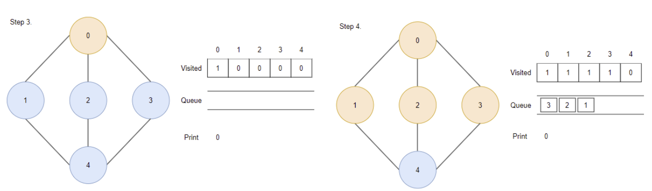 - Step 4. 노드 0에서 인접한 노드들 중 방문한 적 없는 노드 1,2,3을 방문하여 방문 표시한 뒤 큐에 삽입