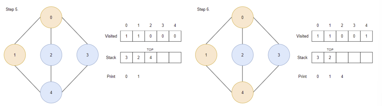 - Step 6. 스택 맨 위에 있는 노드 4를 pop하고 방문 표시