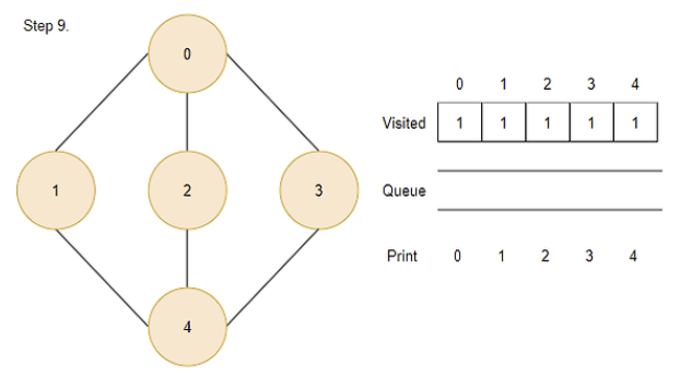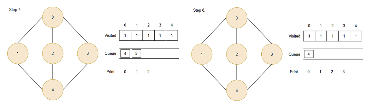 - Step 7~9. 모든 노드를 방문하였기 때문에 큐에서 노드들을 하나씩 제거