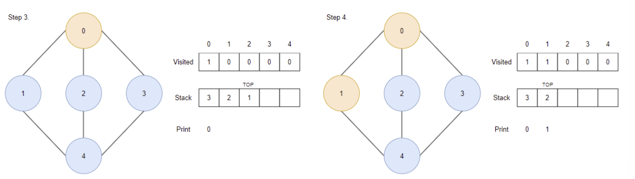 - Step 3. pop된 노드 0에서 방문하지 않은 인접한 노드 1,2,3을 스택에 push(3,2,1순으로 스택에 저장된다고 가정)