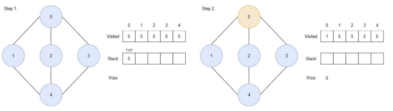 - Step 2. 스택의 맨 위에 있는 노드 0을 pop하고 방문 표시