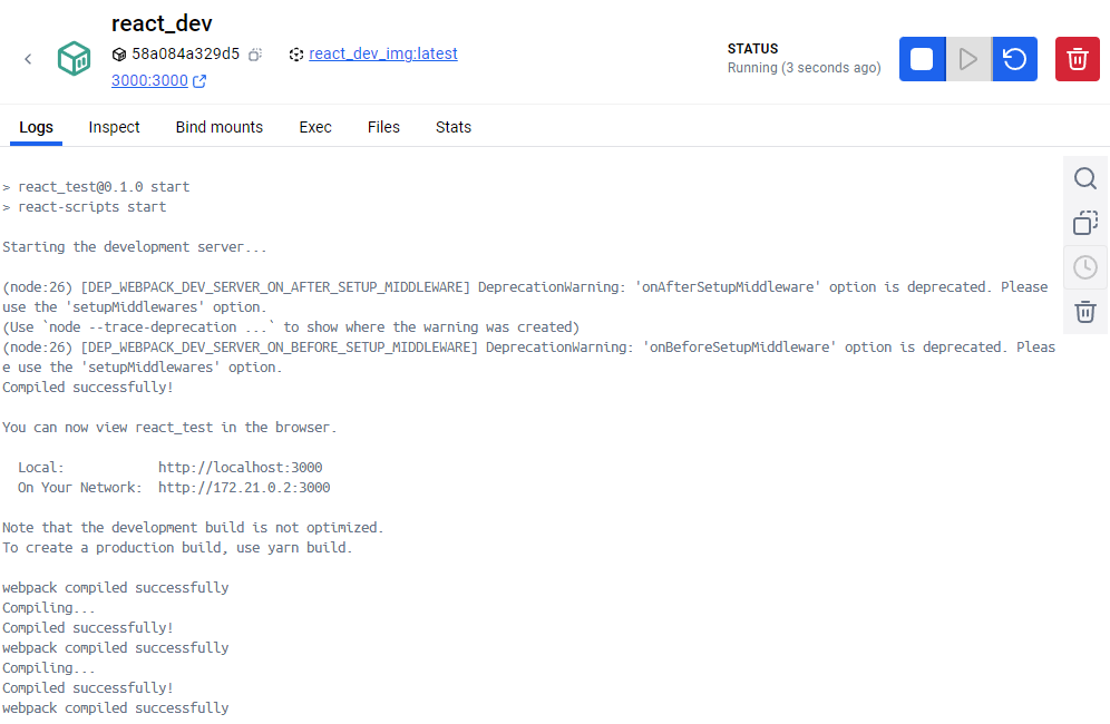 Docker logs를 보면 WATCHPACK_POLLING 으로 실행했을때 변경사항이 있으면 Compiling... 되면서 화면이 바뀌는것을 볼 수 있다.