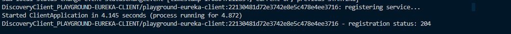 Eureka 서버 로그이다. Clinet 기동 시 서버에서 해당 서비스가 레지스트리에 들어간 것을 확인할 수 있다.