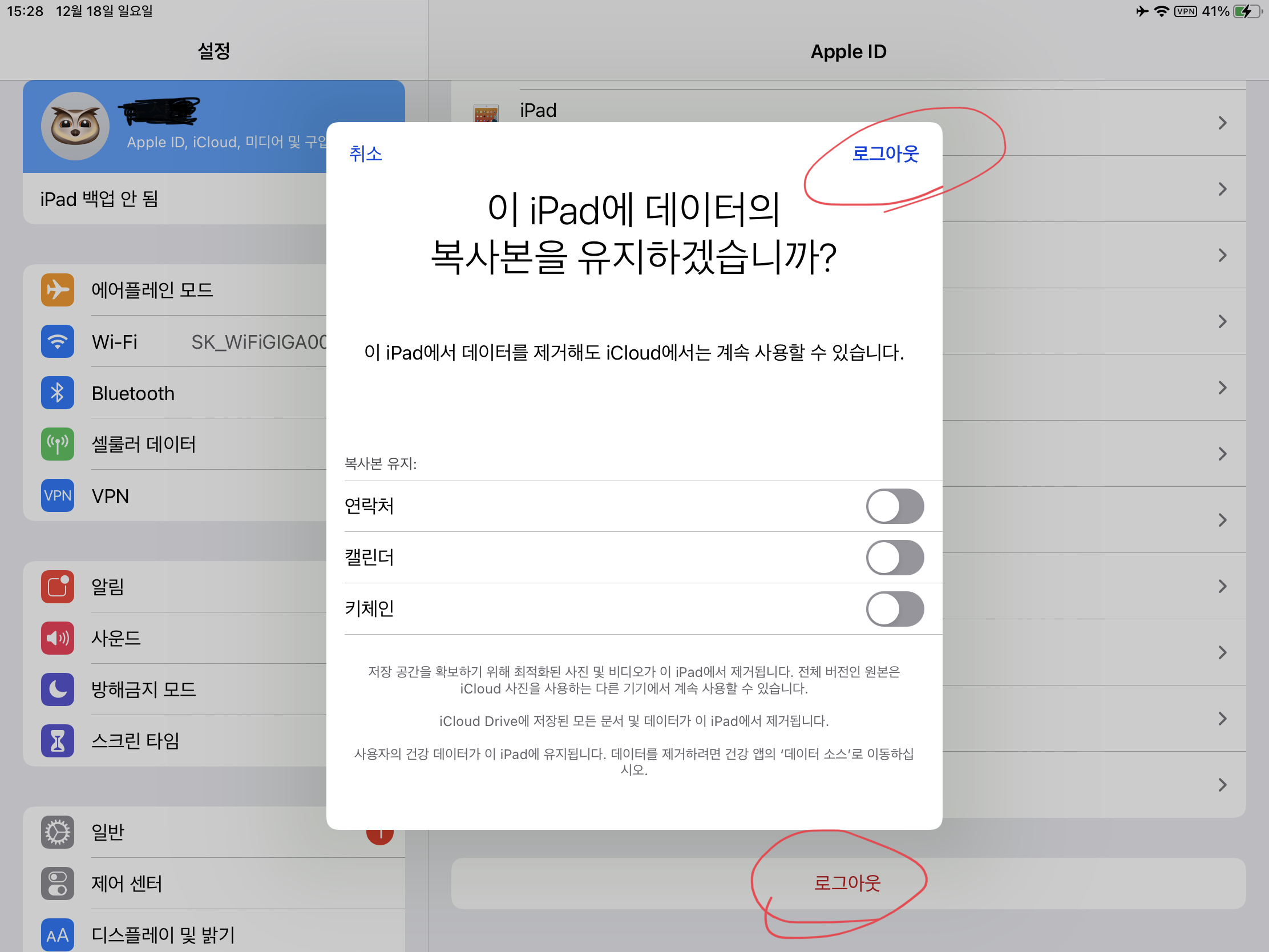 본인의 애플 아이디를 로그아웃 시켜주세요.