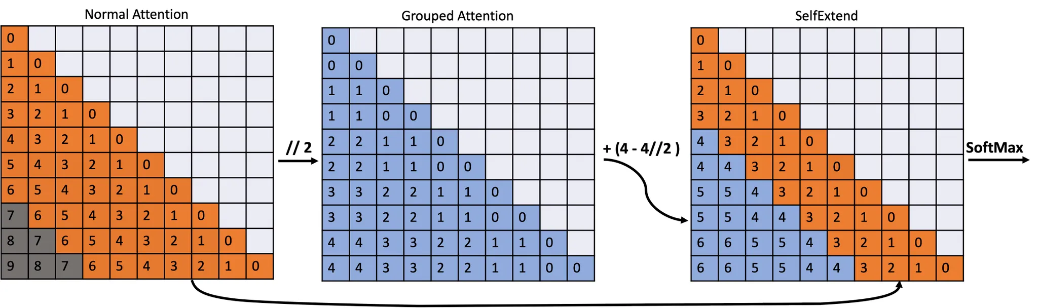 SelfExtend는 LLM의 본질적인 긴 컨텍스트 처리 능력을 확장하기 위해 고안되었습니다. 기존 모델의 자기 주의 메커니즘을 활용하며, LLM의 추론 과정에서 긴 컨텍스트를 처리할 수 있도록 설계되었습니다. SelfExtend는 두 가지 유형의 주의력 메커니즘을 도입합니다: