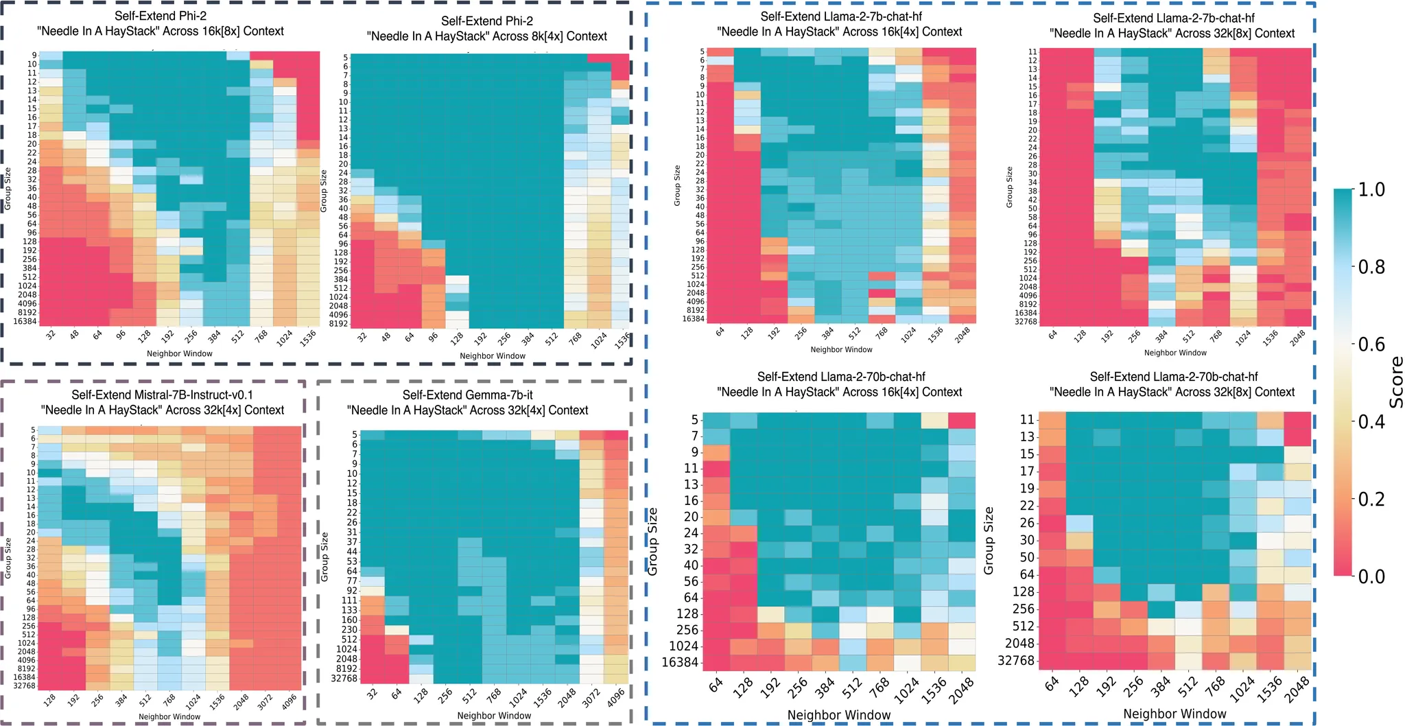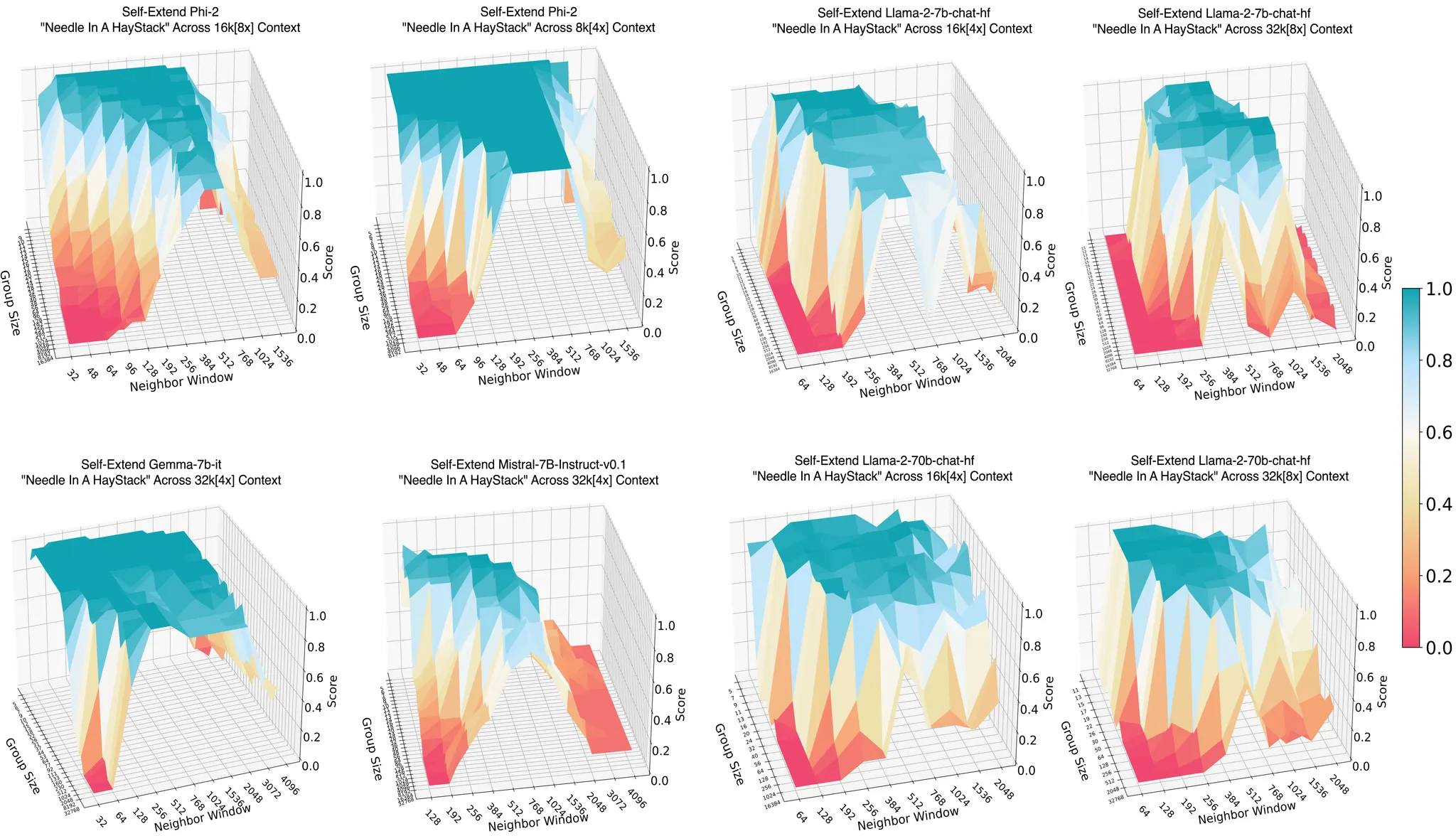 우리는 그룹 크기와 이웃 윈도우 크기가 SelfExtend의 성능에 미치는 영향을 실험했습니다. 그룹 크기가 너무 작거나 너무 클 경우 성능이 떨어질 수 있다는 것을 확인했습니다. 이 결과는 SelfExtend의 성능 최적화에 있어 그룹 크기와 이웃 윈도우 크기를 적절히 설정하는 것이 중요하다는 것을 보여줍니다.