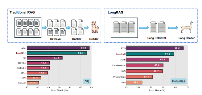 실험 결과, LongRAG는 NQ와 HotpotQA 데이터셋에서 기존 최첨단 모델들과 유사한 성능을 보여주었으며, 별도의 추가 훈련 없이도 우수한 성능을 발휘했습니다.