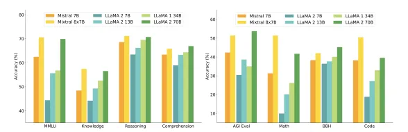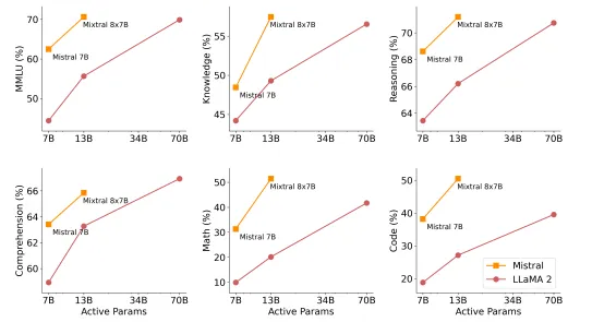 그림 3에서는 Mixtral의 성능이 Llama 2와 비교된 결과를 보여줍니다. Mixtral은 더 적은 활성 파라미터를 사용하면서도 Llama 2 70B보다 대부분의 지표에서 더 높은 성능을 보입니다.