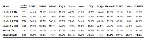 표 2는 Mixtral이 대부분의 인기 있는 벤치마크에서 Llama 2 70B의 성능을 초과하거나 동등한 성능을 보여주는 것을 나타냅니다. Mixtral은 추론 시 활성 파라미터를 5배 적게 사용하면서도 거의 모든 벤치마크에서 뛰어난 성능을 보입니다.