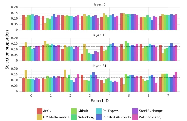 이를 조사하기 위해, 우리는 The Pile 검증 데이터셋 [14]의 다양한 하위 집합에서 선택된 전문가의 분포를 측정했습니다. 예를 들어, 모든 레이어에서 특정 주제에 대한 전문가 할당 패턴을 관찰하지 못했지만, ArXiv 문서(텍스트로 작성된 문서), 생물학(PubMed 초록), 철학(PhilPapers 문서)에서 전문가 할당은 유사하게 나타났습니다.