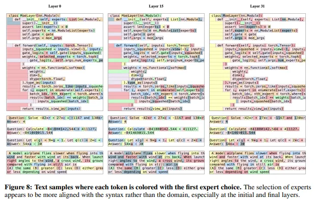 그림 8: 각 토큰이 첫 번째 전문가 선택으로 색칠된 텍스트 샘플. 전문가 선택은 특히 초기 및 최종 계층에서 도메인보다는 구문과 더 일치하는 것으로 보입니다.