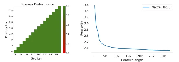 그림 4: Mixtral의 장거리 성능. (왼쪽) Mixtral은 패스키의 위치와 입력 시퀀스의 길이에 관계없이 패스키 작업의 검색 정확도가 100%입니다. (오른쪽) Proof-pile 데이터 세트에 대한 Mixtral의 퍼플렉시티는 컨텍스트 길이가 증가함에 따라 단조롭게 감소합니다.
