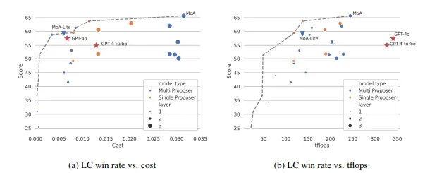 (b) LC 승률과 테라 플로팅 연산 횟수(TFLOPS) 간의 트레이드오프. 우리는 TFLOPS를 대리 변수로 사용하여 지연 시간(latency)를 측정합니다. 각 MoA 층에서 다중 제안자가 참여하는 경우 더 많은 연산이 발생하는데, 이는 단일 제안자와 비교됩니다. 이 그림에서, 우리는 동일한 성능을 유지하면서 비용이 적게 드는 모델들이 Pareto 전선에서 어떤 위치에 있는지를 보여줍니다. Mixture-of-Agents 접근 방식은 비용과 성능 측면에서 GPT-4 Turbo 및 GPT-4 Omni보다 우수합니다.
