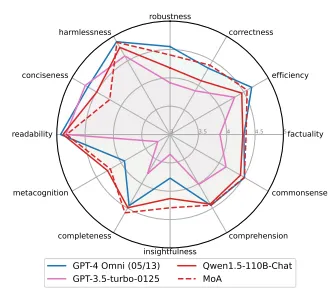 FLASK는 모델의 세밀한 평가를 제공합니다. 우리의 MoA는 정확성, 오류 감지, 완성도, 메타 인식에서 GPT-4 Omni를 능가했으며, 특히 응답의 응집성에서 눈에 띄는 향상을 보였습니다. 그러나 일부 영역에서는 약간의 부족함을 보였습니다.