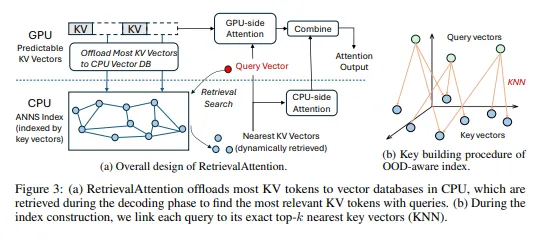 토큰 생성 중 벡터 검색을 가속화하기 위해, RetrievalAttention은 기존 쿼리 벡터를 사용하여 키 벡터에 대한 인덱스를 미리 생성하고, 주의 계산 동안 벡터 검색을 가속화합니다. RetrievalAttention은 쿼리 벡터와 키 벡터 간의 분포 차이를 완화하는 명시적인 연결을 구축합니다. 그림 3b에서 설명하듯이, RetrievalAttention은 기존의 KNN(K-Nearest Neighbors) 접근법을 활용하여, 벡터 분포의 불일치를 해결하는 구조를 사용합니다. 이 구조를 통해 디코딩 과정에서 KNN을 사용해, 쿼리 벡터와 가장 가까운 키 벡터를 효율적으로 검색합니다.