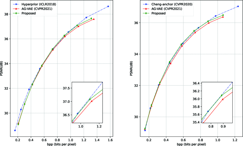 그러나 AG-VAE 방식은 높은 비트 전송률에서 상당한 성능 저하를 보이는데, 이는 잠재 변수를 스케일링하는 과정에서 발생하는 부정확한 엔트로피 추정 때문이라고 한다.