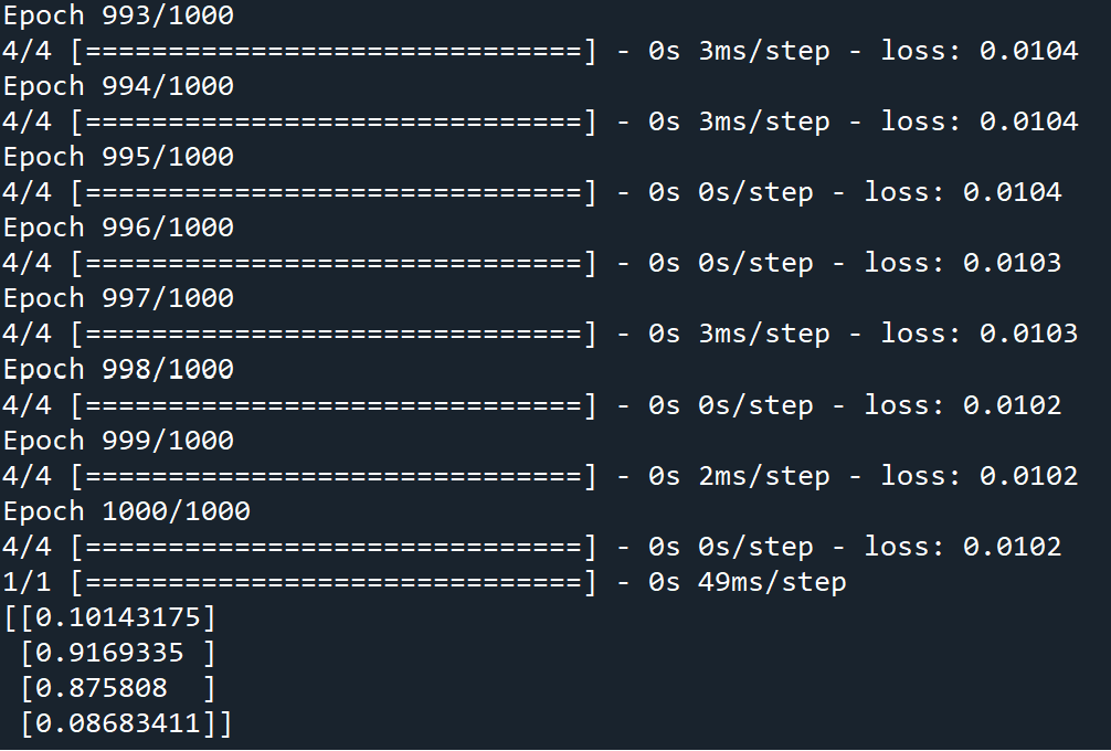 해당 과정을 진행하면 아래와 같이 10000번의 학습이 반복되며 손실함수값을 출력하고 내부에서 가중치 변경이 일어난다.