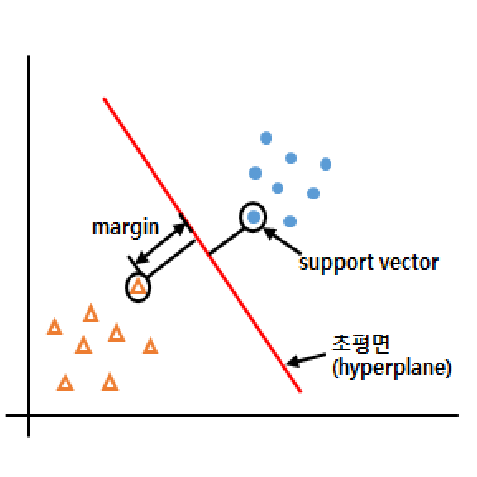 - 초평면(Hyperplane) : support vector와 margin을 이용해서 그린 선의 최적의 경계