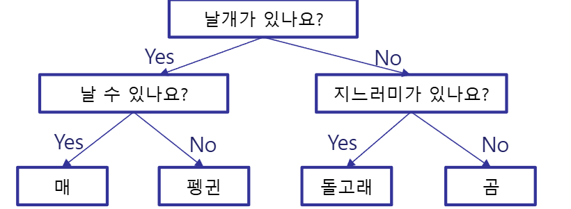 기본적인 결정에 도달하기 위하여 Yes/No 질문을 이어나가며 학습