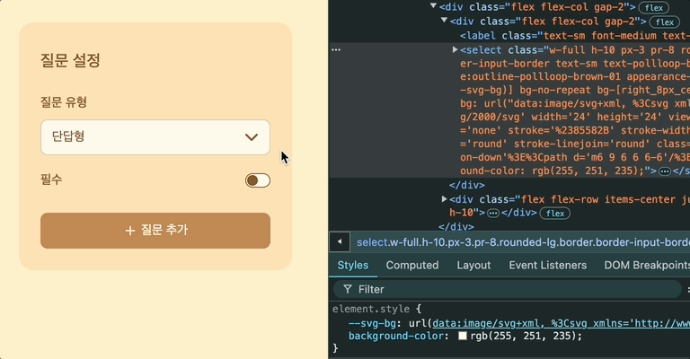 'w-full h-10 px-3 pr-8 rounded-lg border border-input-border text-sm text-pollloop-brown-01 focus-visible:outline-pollloop-brown-01 appearance-none bg-[image:var(--svg-bg)] bg-no-repeat bg-[right_8px_center]',
