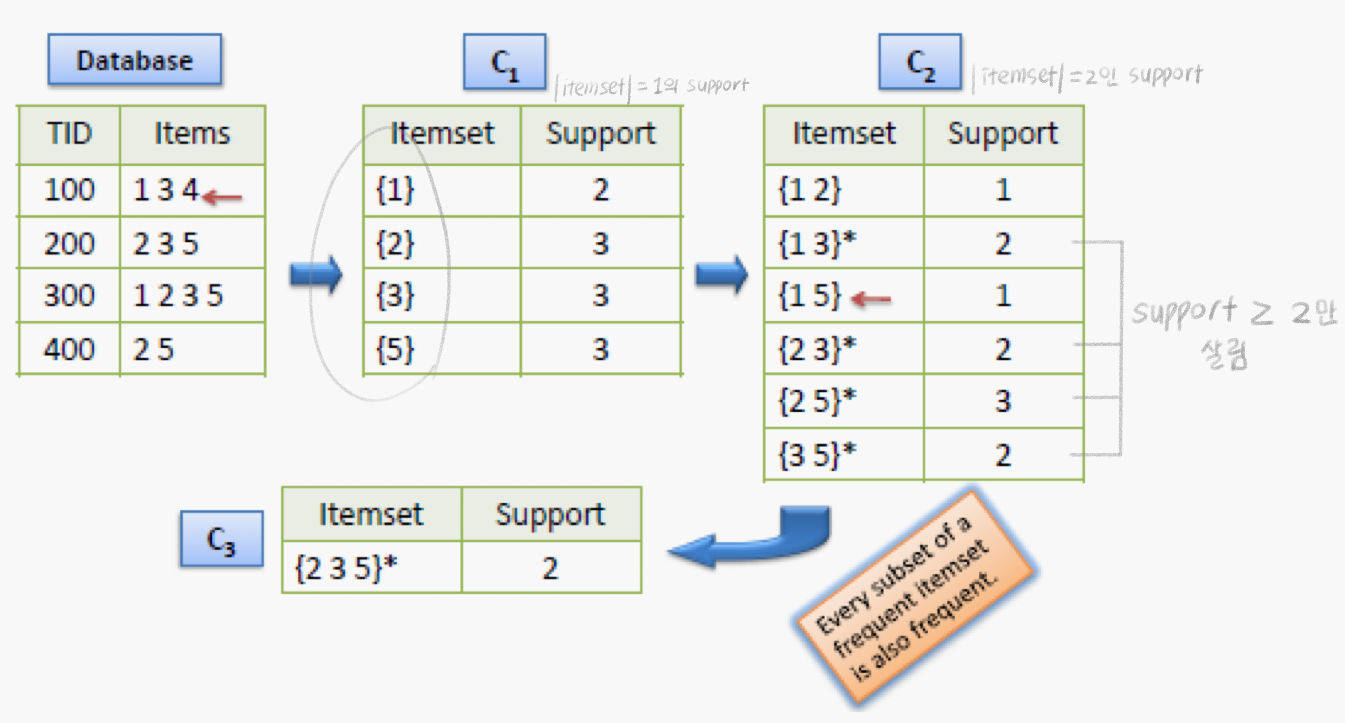 idataset에서 충분히 자주 표시되는 개별의 item을 찾아서 식별하고, 더 큰 itemset으로 확장하여 진행함