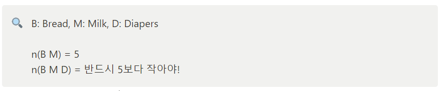 anti-monotone 속성의 support: itemset의 support는 하위 집합의 support를 초과하지 않음