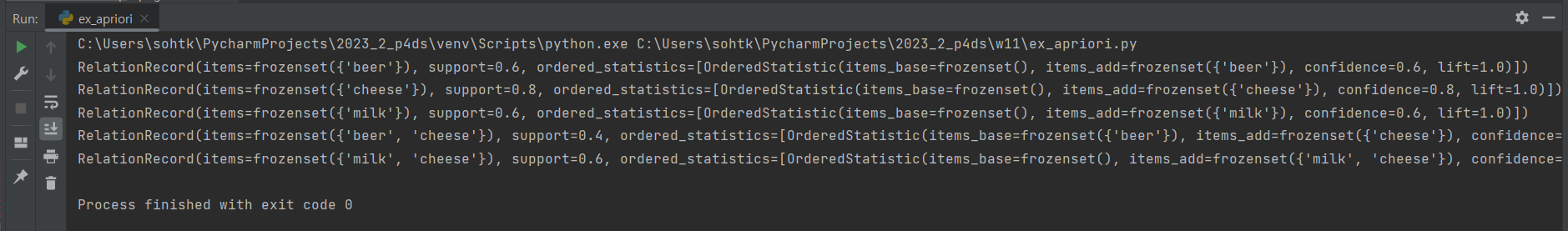 results = list(apriori(transactions, min_support=0.3, min_confidence=0.5))
