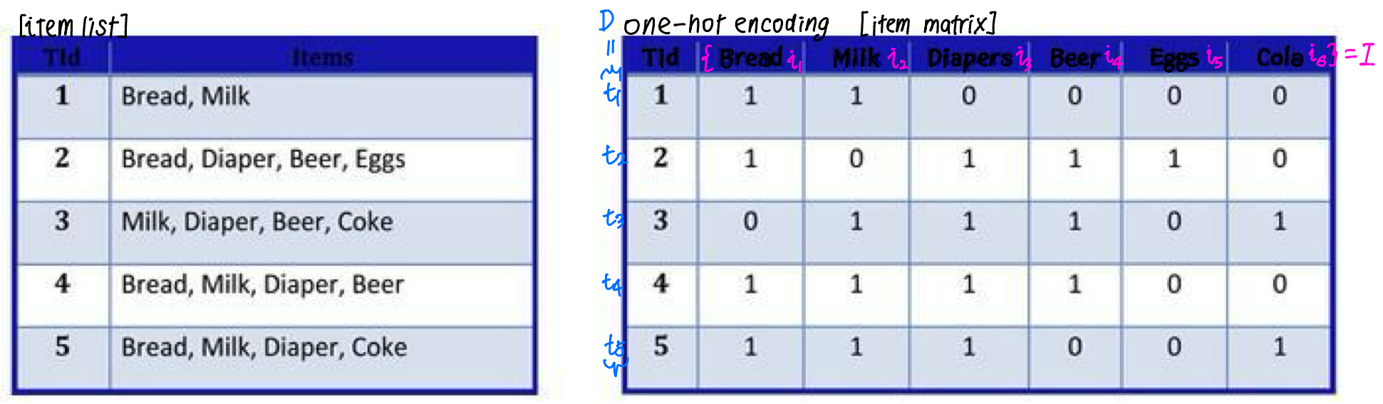 - 각 트랜잭션에는 I의 하위 집합이 포함되어 있음